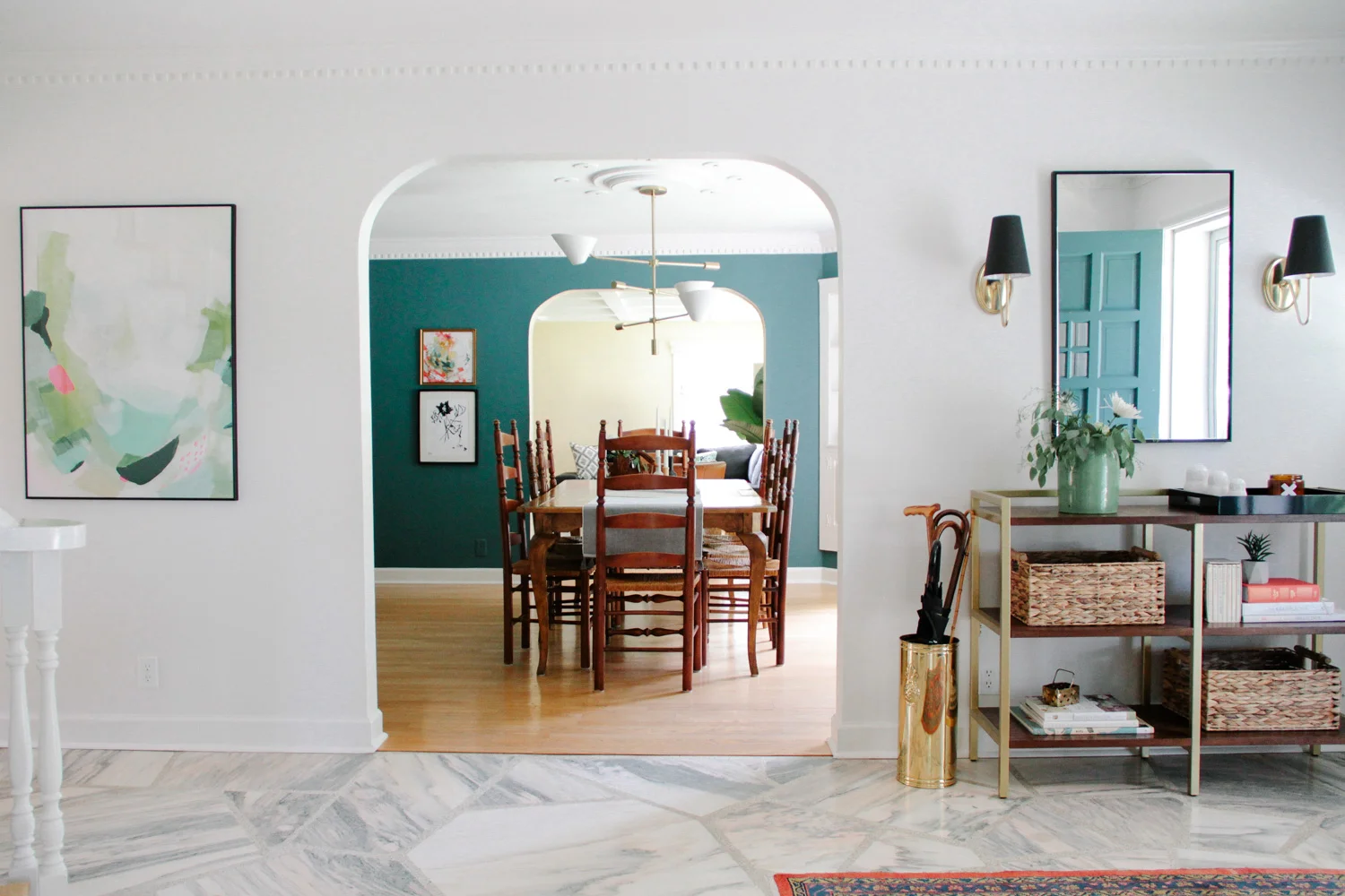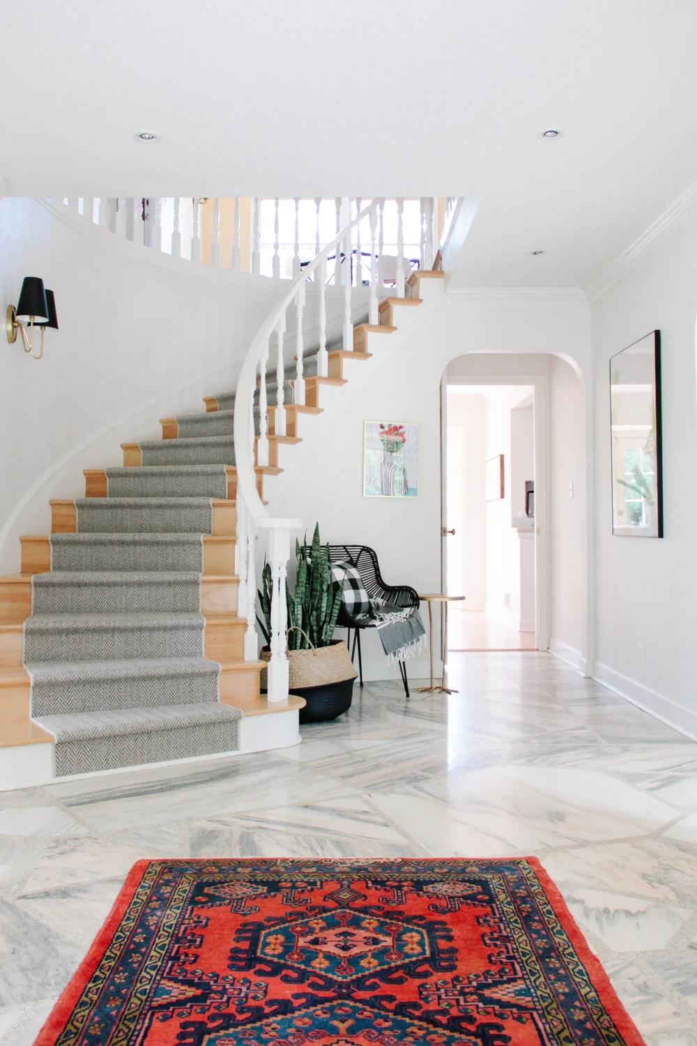 On the other side of the room the front door was painted Polished Slate from Benjamin Moore. Also therein lies the vintage accent rug of my dreams. Found on Chairish, I chose this one for its vibrant coral color and how it would relate to the subtle pink throughout the marble. And since antique rugs are built to last they standup to high traffic areas well. The small-scale allover pattern has the added benefit of expertly camouflaging dirt and stains – perfect for both an entryway and a house with small children!