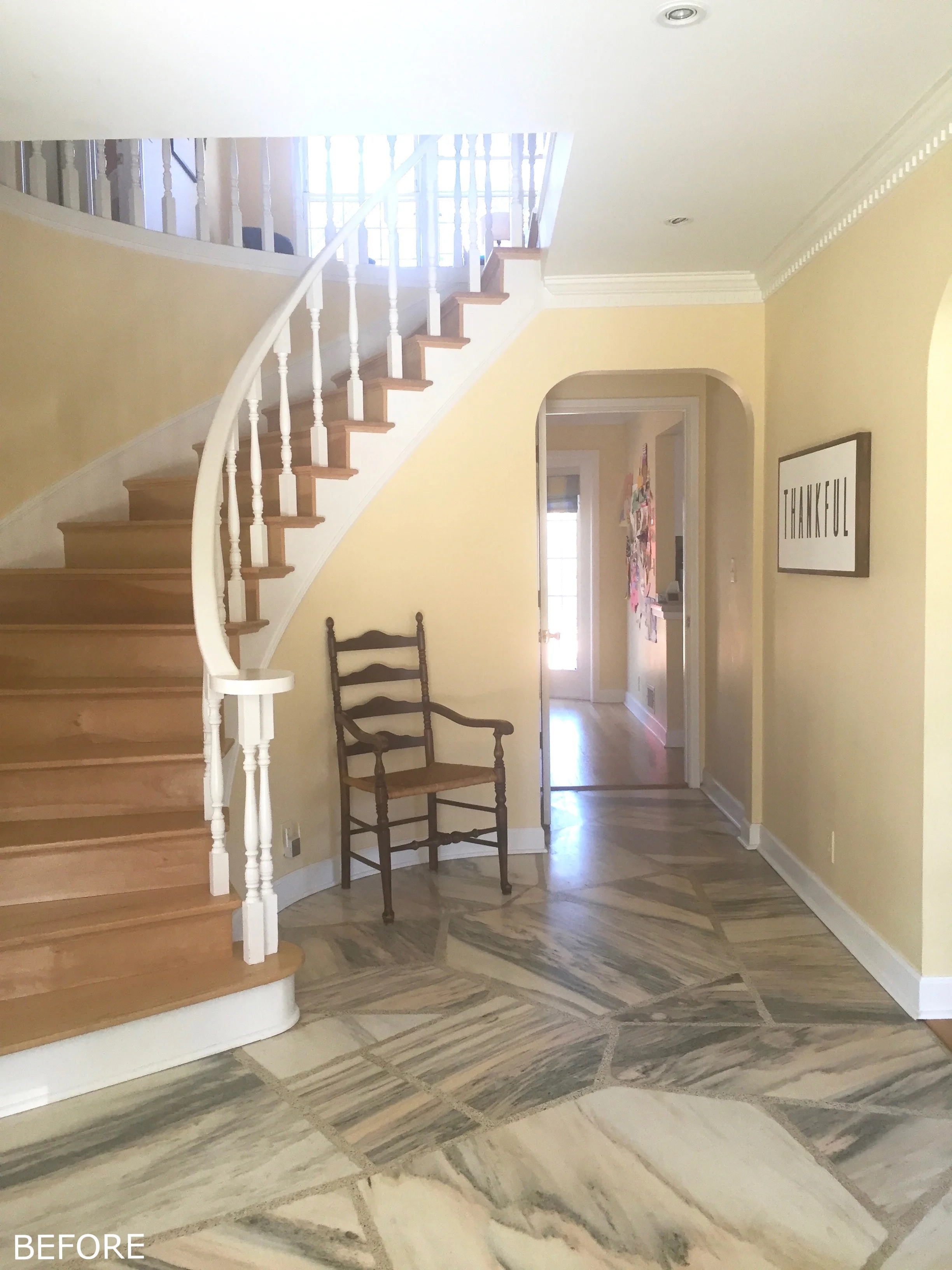The previous owners had recently refinished the hardwoods throughout, including the curved entry stairs. And the irregular shaped marble flooring with its pink veining had me smitten! Those yellow walls, though, weren't doing the room (or the floors) any justice.