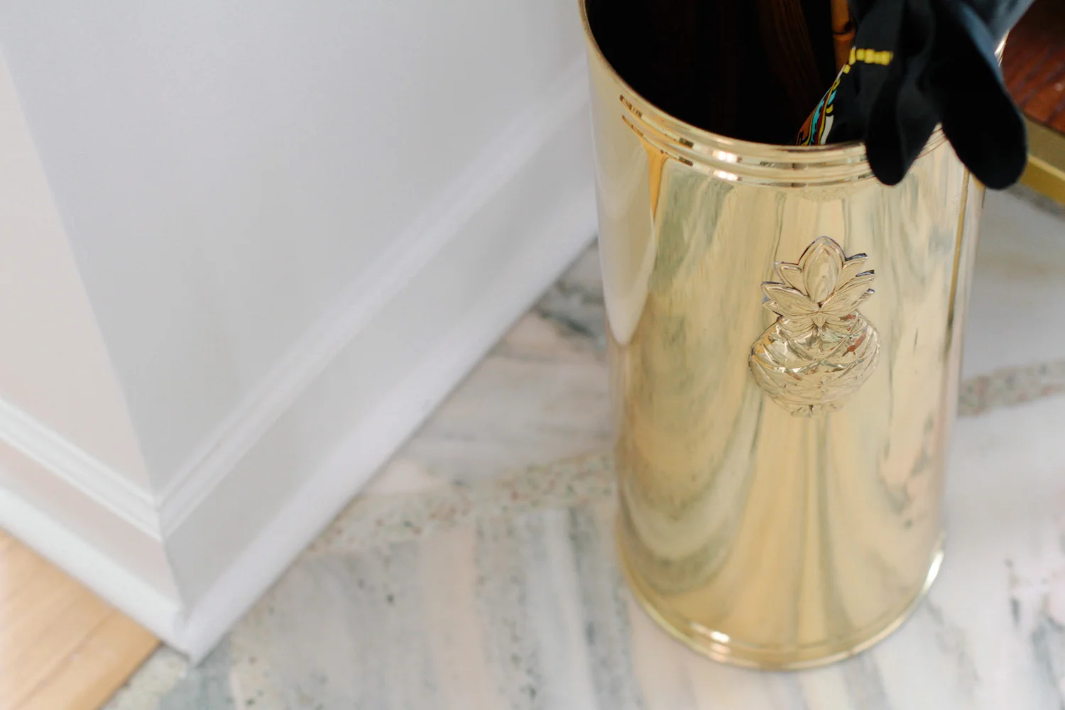 Ok, ok, I have a thing for umbrellas stands. I know they're basically obsolete and unnecessary, but what's a finished and styled entryway without some artfully arranged aged canes and classic curved umbrella handles poking from atop an elegant stand? Especially when that stand is brass with an embossed pineapple!