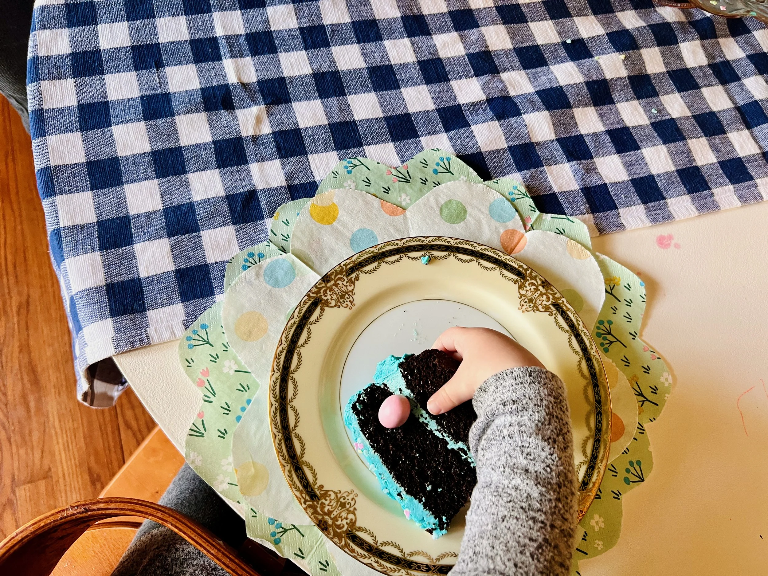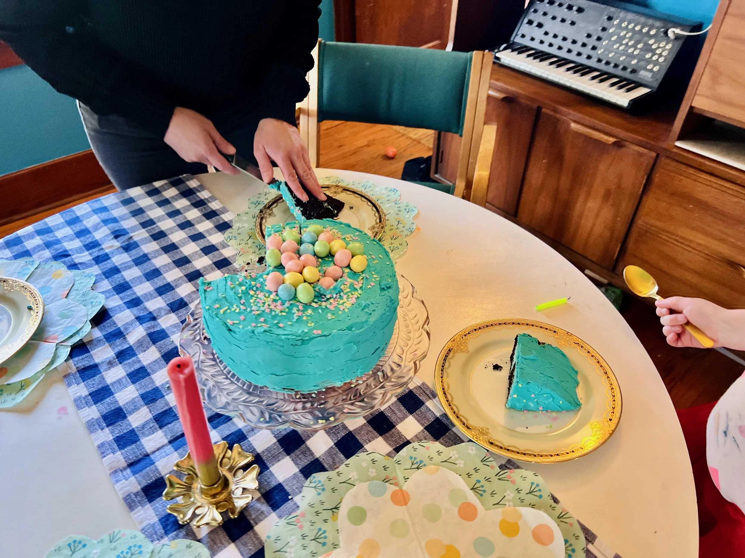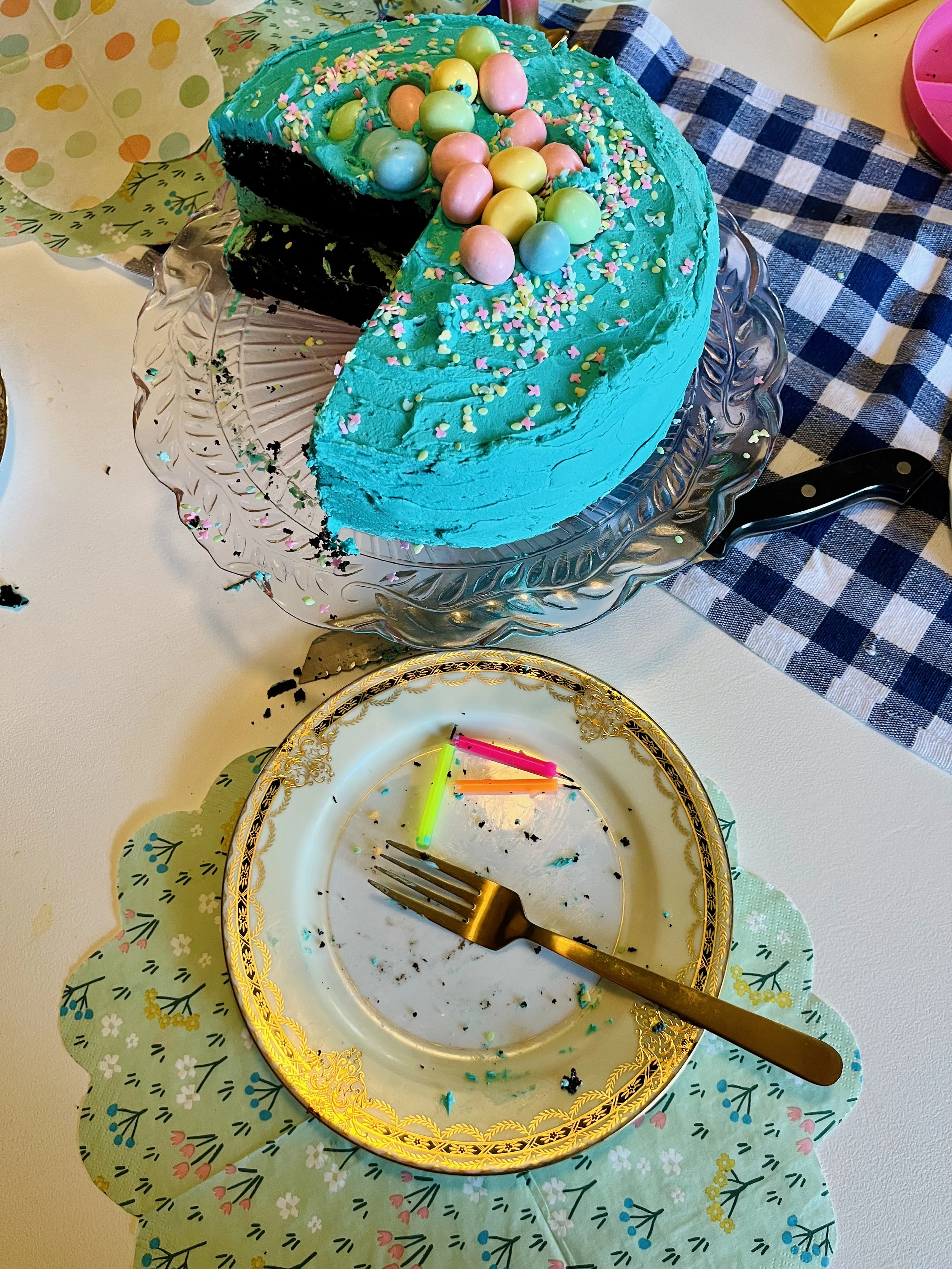 This year Bea’s request was for a blue cake. A couple of drops of blue food coloring and one of green gave us this hue. In keeping with our spring theme, I topped it with pastel sprinkles and the quintessential candy-coated chocolate eggs (for the record, the eggs aren’t gf/df so I didn’t eat them).