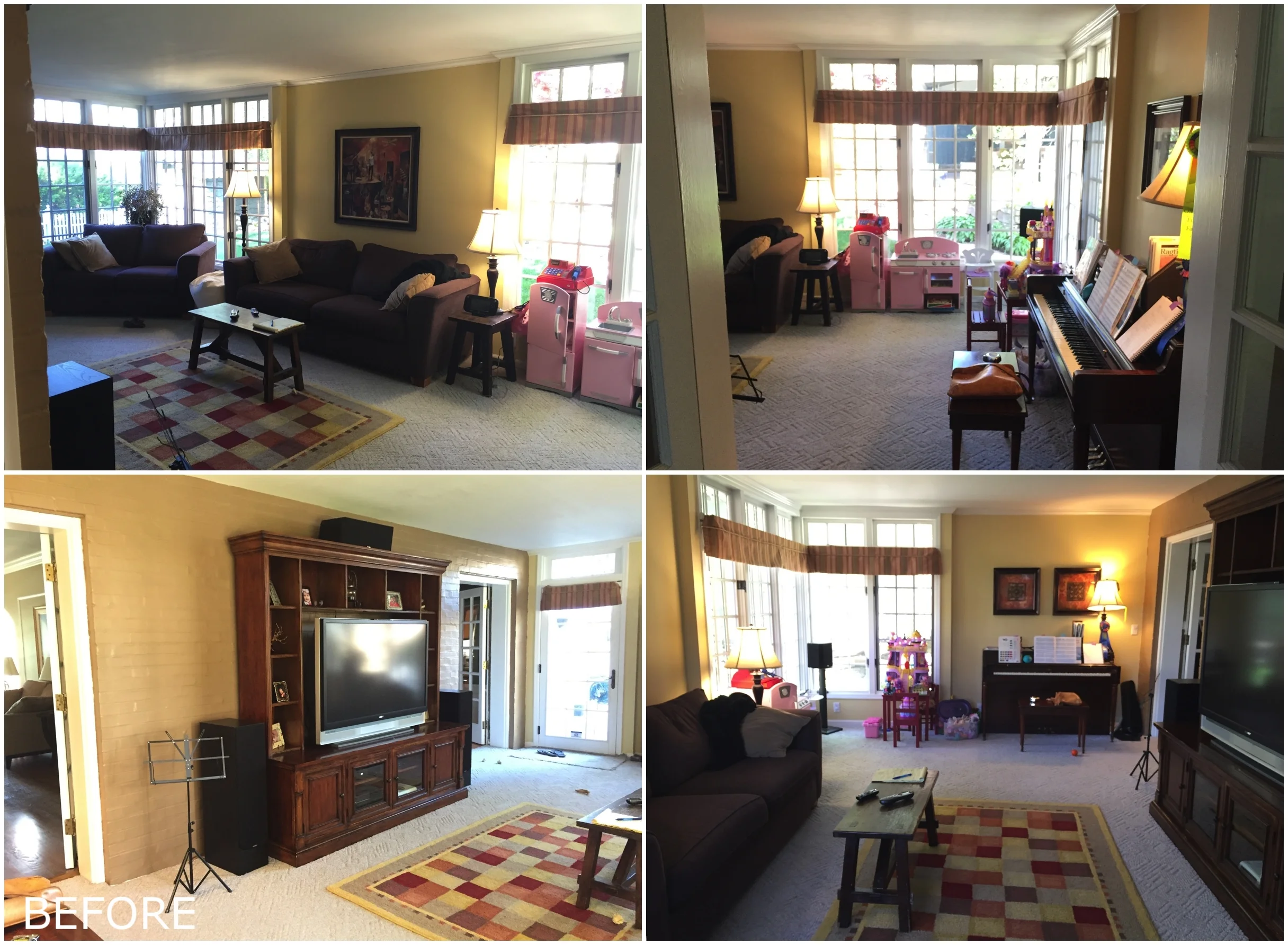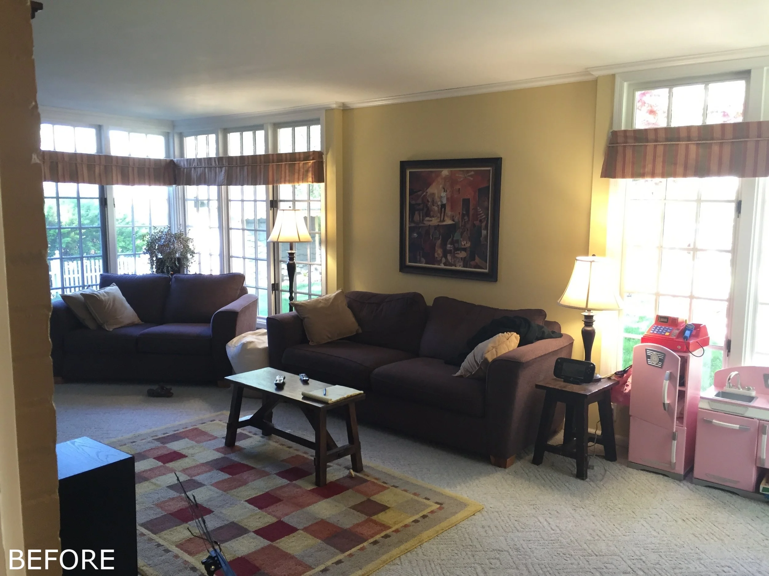 One of the last remaining spaces in their home to be decorated, Adrianne and Charlie's family room housed much of the leftover furniture they'd accumulated over the years. The window treatments were a remnant from the old homeowner, and the carpet had seen better days. It wasn't at all indicative of the chic stylings in the rest of their classic whitewashed brick colonial. But despite it being last on the list for an update it was probably the most used room in the house – family game nights, movie marathons, piano and saxophone jam sessions... It was important that it be a family friendly, cozy retreat, yet still incorporate the traditional aesthetic of the rest of the home.